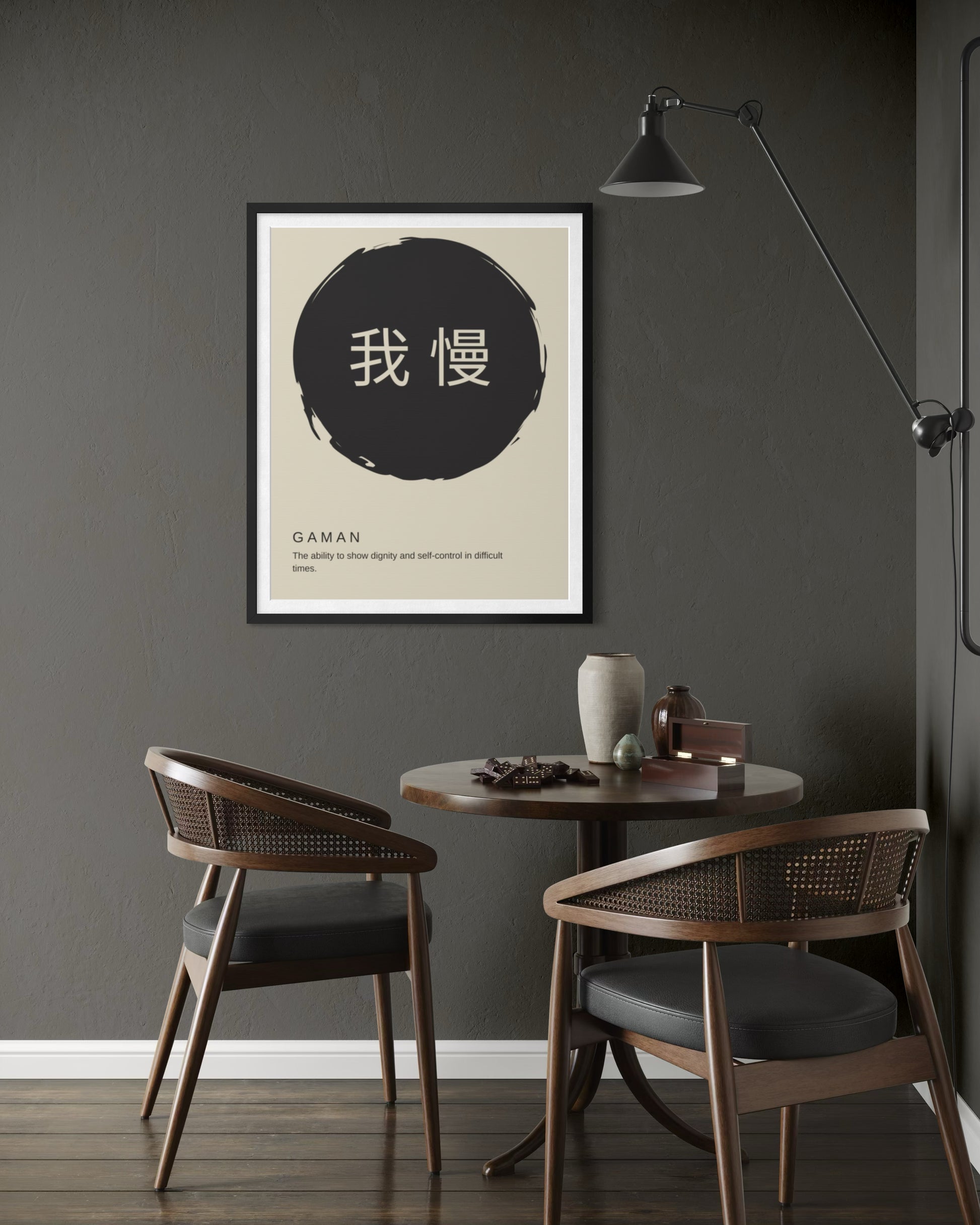 De Gaman poster symboliseert doorzettingsvermogen en innerlijke rust. Het leert ons kalm te blijven, zelfs in moeilijke tijden, met waardigheid, geduld en kracht. Deze poster met contrast kleuren en minimalistische vorm brengen diezelfde sereniteit in je interieur. Een tijdloos ontwerp dat moed en rust samenbrengt, stil maar krachtig aanwezig aan je muur.